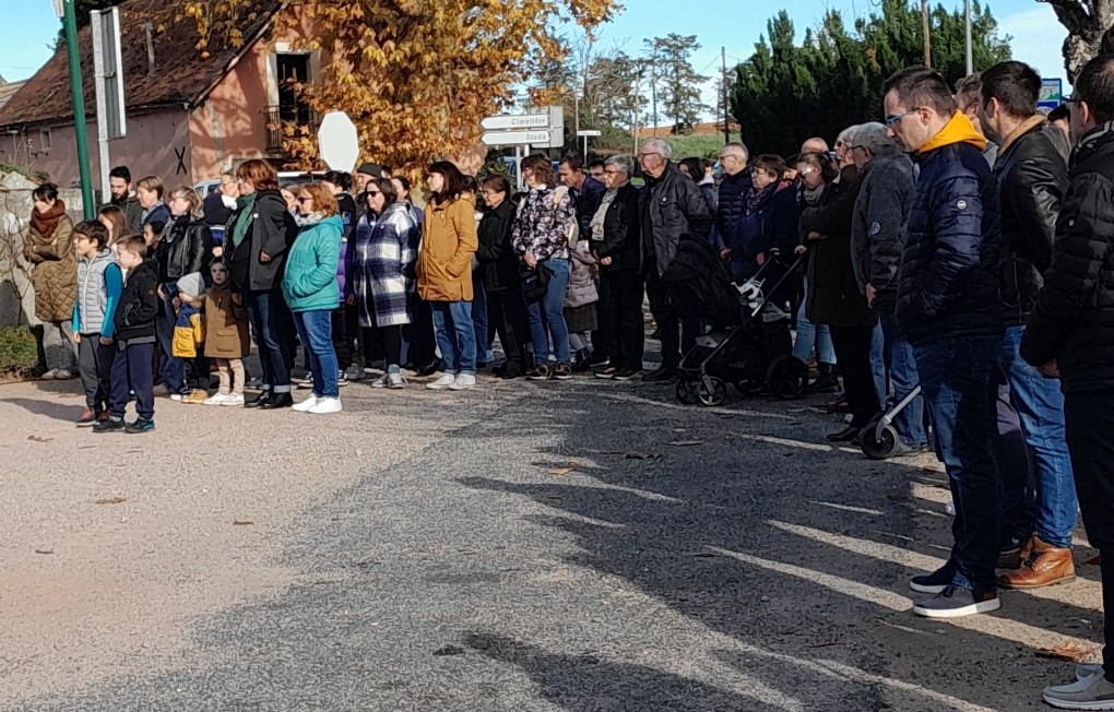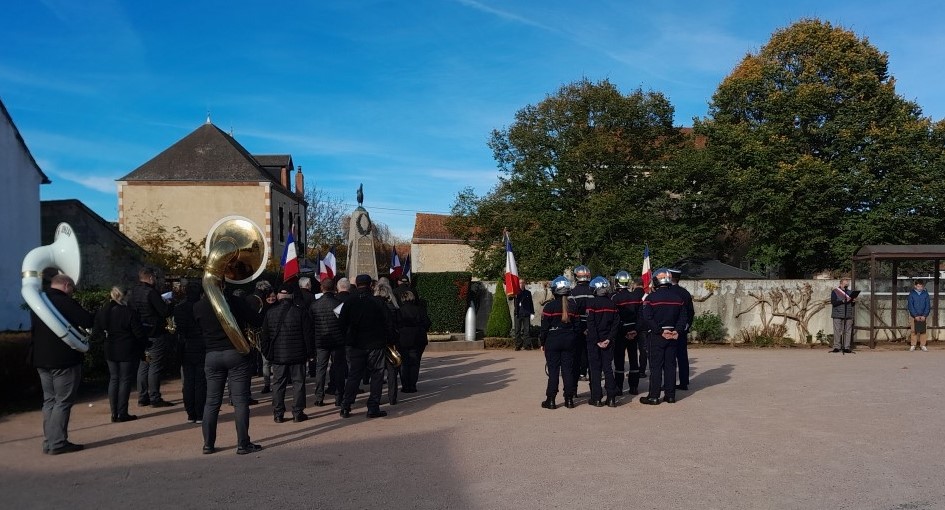 C’est avec une grande satisfaction que nous avons dénombré une belle assistance à la cérémonie de commémoration de l’Armistice du 11 novembre 1918 à Saint-germain de Salles. Emmené par la Société Musicale de Jenzat placée sous la direction de Fred Brunet, son chef, le cortège a défilé de la cour de l’école jusqu’à la Place du Souvenir. Suivaient : les trois porte-drapeaux, Isabella Cozma (Sapeurs-Pompiers), Marius Cozma (Commune) et Johan Lakota (Anciens Combattants), le détachement du Centre d’Intervention d’Etroussat placé sous le commandement du Sergent Chef Alexandre Avignon, le Gendarme Calbel de la Brigade de Chantelle, le Maire et son Conseil Municipal, l’école de Saint-Germain de Salles et ses jeunes élèves emmenés par sa Directrice, Sophie Lafanechère aidée par les employées communales Joëlle Bufferne et Béatrice Coffinet, les présidentes, présidents et dirigeants des associations et la nombreuse assistance. Sur la Place du Souvenir, après les dépôts de gerbes de la Commune et du Souvenir Français, l’appel aux morts, la minute de recueillement et la Marseillaise, les discours ont été lus par Robert Pinfort, maire, et par Tom Lafanechère. Le cortège s’est ensuite reformé pour retourner dans la cour de l’école où la Société Musicale de Jenzat a interprété de beaux morceaux choisis. Robert Pinfort a également présenté Margaux Dardaine, la jeune saint-germanoise qui vient d’intégrer les rangs des pompiers d’Etroussat et qui est également musicienne à la Société Musicale de Jenzat. Après les remerciements, le Maire a invité l’assistance à partager le verre de l’amitié à la Salle d’Exposition.